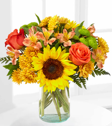 Description: Say hello to Autumn with this bouquet filled with bold harvest hues and luscious blooms. Thoughtfully arranged with the freshness of Fall in mind, a collection of orange roses, bright sunflowers, orange alstroemeria and daisies is set beautifully in a clear glass vase. Whether it's seasonal decor for your home or a gift for a loved one, our Autumn Splendor Bouquet is sure to make any home its placed in feel warm and bright.