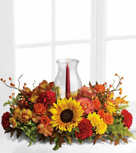 Description: A classic hurricane lamp glowing warmly, shedding its soft light on a lush arrangement of autumn's most gorgeous flowers - what a feast for the eyes. And the soul. Happy Thanksgiving!