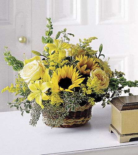 Description: A beautiful bouquet to say you'll never forget them. Yellow roses, lilies and sunflowers are sweetly arranged with other greens in a basket.