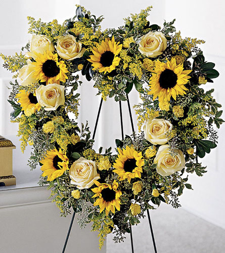 Description: Sunflowers, roses, and carnations are used to create a brilliant expression of love and support.