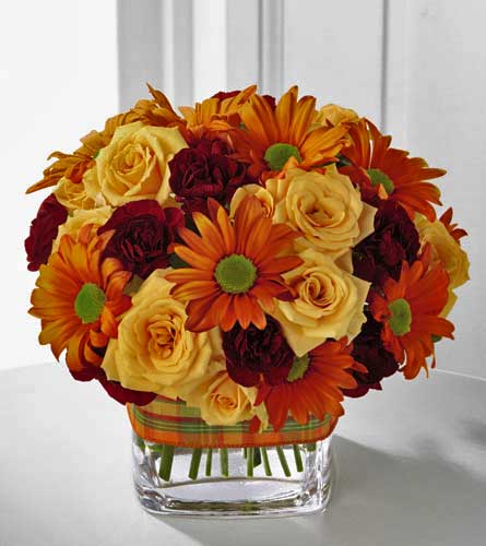 The Golden Autumn Bouquet spreads seasonal sunshine to celebrate the arrival of Fall. Peach spray roses, burgundy miniature carnations, and yellow traditional daisies are a spirited and sweet bouquet arranged in a clear glass vase accented with a colorful designer ribbon.