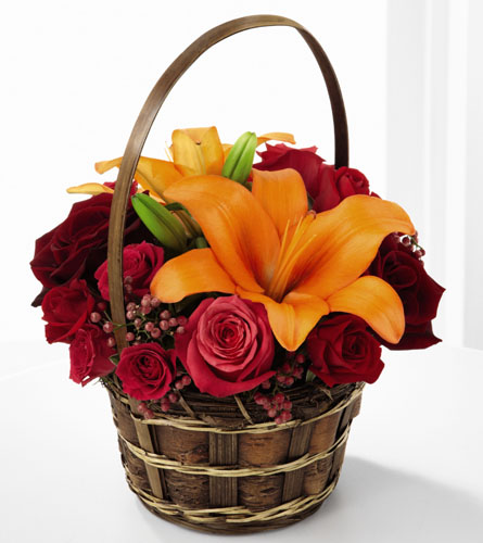 The Harvest Blooms Basket exudes radiant colour and happy wishes for a fantastic Fall season. Dark red roses and spray roses, fuchsia roses and spray roses, bright orange Asiatic Lilies and pepperberry stems are gorgeously situated in a round brown basket to create an inspirational arrangement of Autumn wonder that will spread warmth and joy.