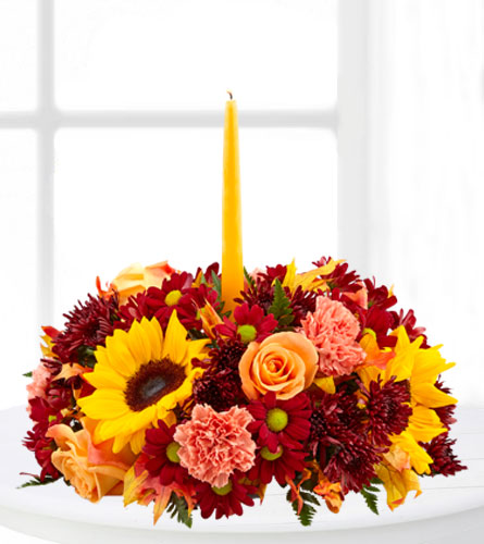 Description: Our Giving Thanks Centerpiece is sure to add a touch of heartfelt warmth to your celebration with its collection of orange roses, sunflowers and orange carnations arranged around a lovely taper candle. Whether you're a guest or the host, complete the table with an elegant centerpiece sure to brighten up any room. Candle color may vary in a fall tone.