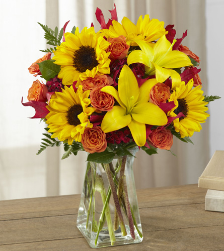 Description: The Harvest Heartstrings Bouquet is a fresh burst of color and autumn light that will surround your special recipient with beauty. Exquisite Cherry Brandy Roses are brought together with purple Peruvian Lilies, orange Asiatic Lilies and burgundy mini carnations accented with lush greens and arranged in a classic clear glass vase. Highlighted by a deep eggplant satin ribbon tied around the neck of the vase, this bouquet is an arrangement that speaks to the heart of the fall season.