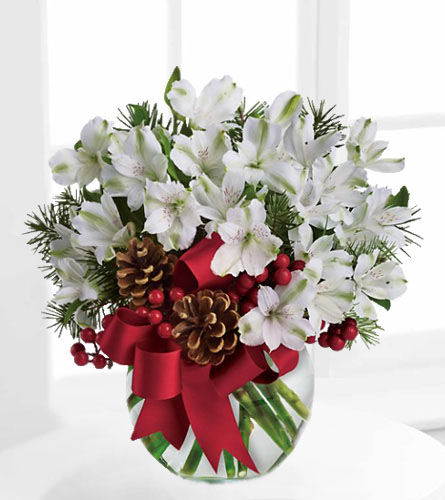 Description: Perfect for friends, family and colleagues this holiday season. Pretty and long-lasting white alstroemeria, berries, pinecones and fir arranged in a clear glass bowl. Tied with a bright red satin ribbon, it's truly charming. Another version is available to celebrate Hanukkah with blue ribbon and silver berries, by request.