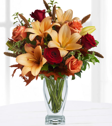 Description: Absolutely exquisite! This bouquet is a fall flower fantasy come true. All the richness of this colorful season is captured in a stylish glass vase. So pretty, you might have to order one for a friend and one for yourself! Beautiful orange and red roses, yellow Asiatic lilies, autumn oak leaves and more are beautifully arranged in a classic clear vase.