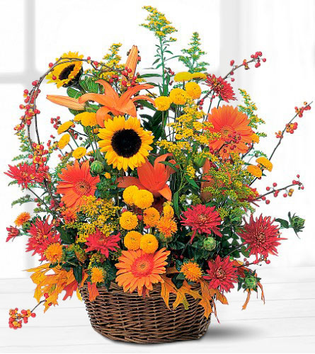 Description: With gorgeous fall colors of yellow, rust and orange, this spectacular arrangement captures the essence of this colorful season. Chrysanthemums, gerberas, lilies and sunflowers delivered in a beautiful wicker basket.
