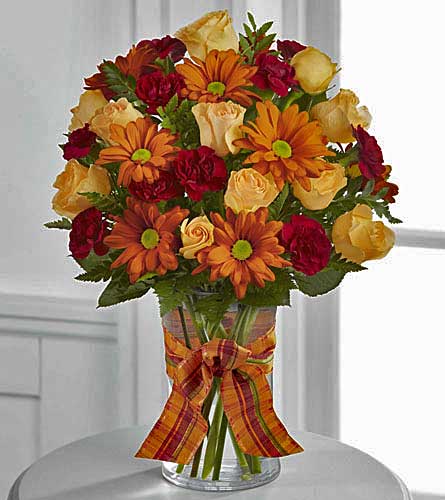 Description: The Golden Autumn Bouquet exudes the warmth and comfort of the harvest season with each colorful bloom. Peach spray roses, burgundy mini carnations, butterscotch chrysanthemums and lush greens are arranged beautifully in a classic clear glass vase accented with an orange plaid ribbon around the neck, creating a truly wonderful bouquet that will send your sweetest sentiments to your special recipient for a fantastic fall.